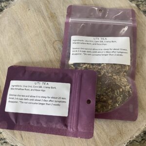 This blend is made with Uva Ursi, Corn Silk, Cramp Bark, Marshmallow Root, and Rose Hips. All of these herbs are organic.